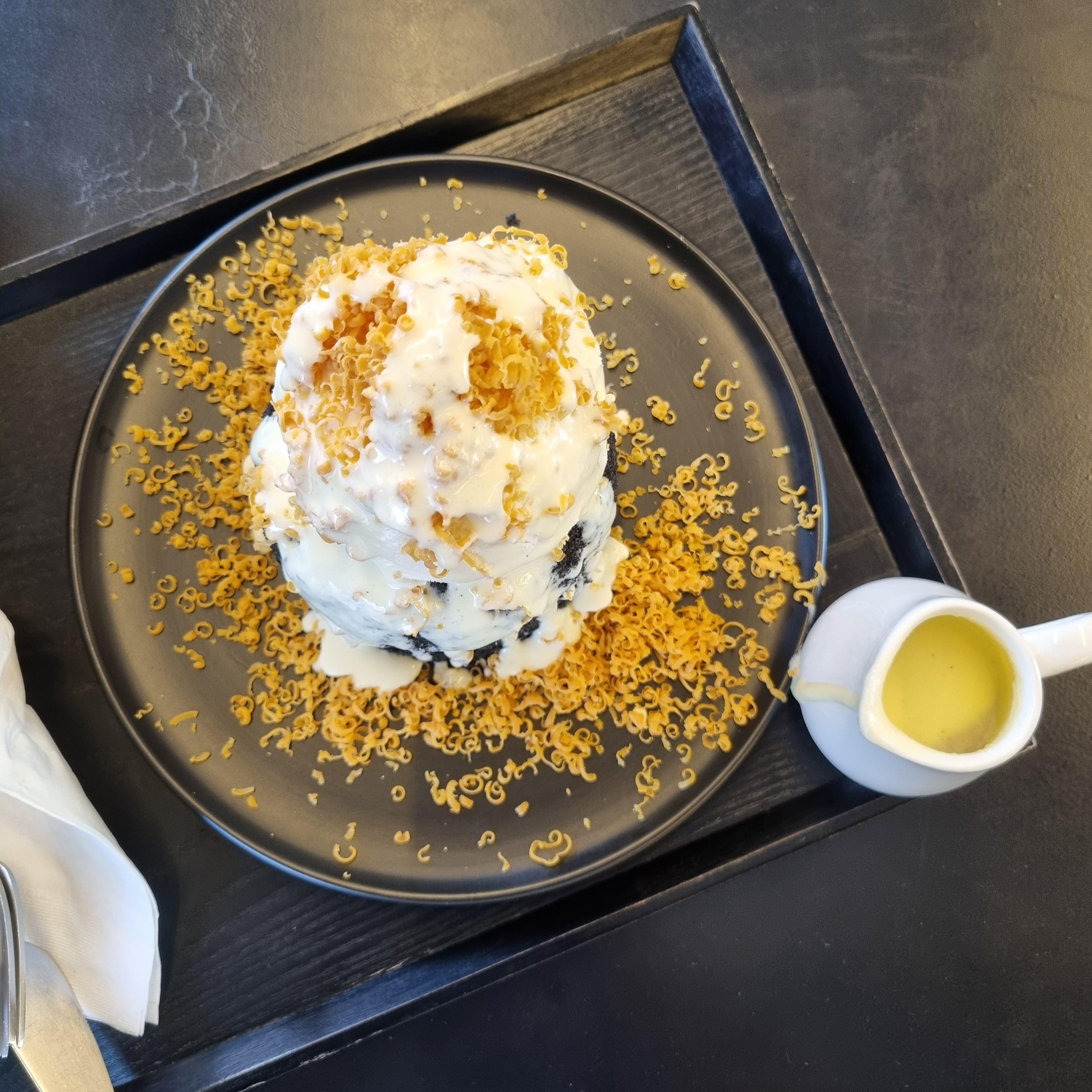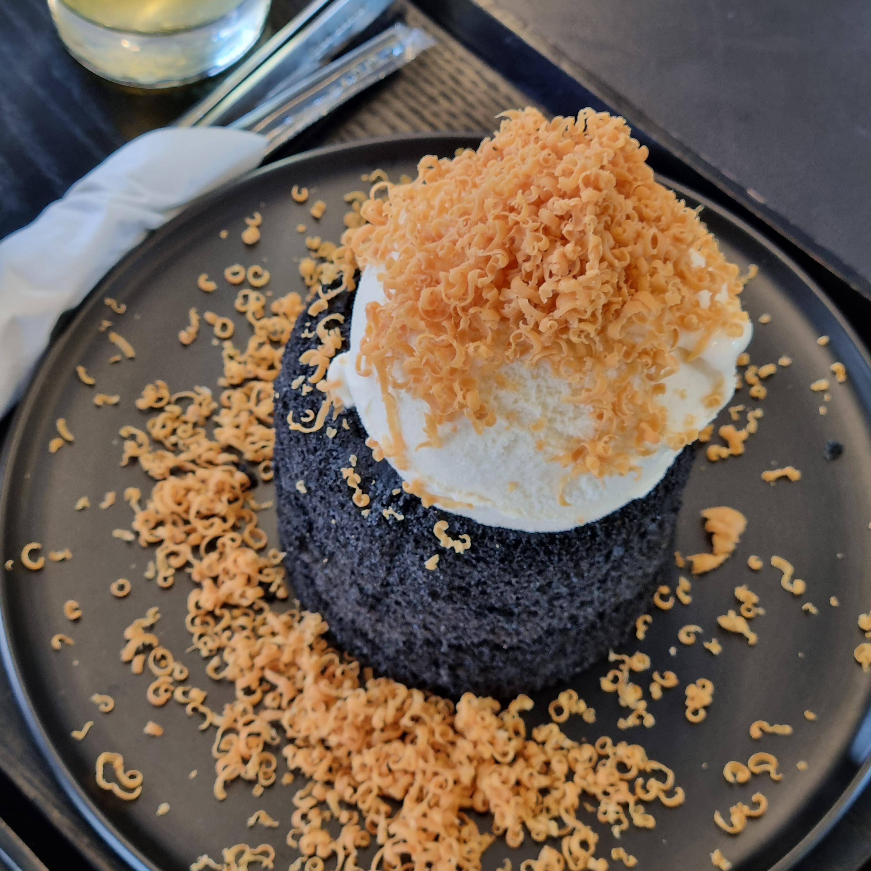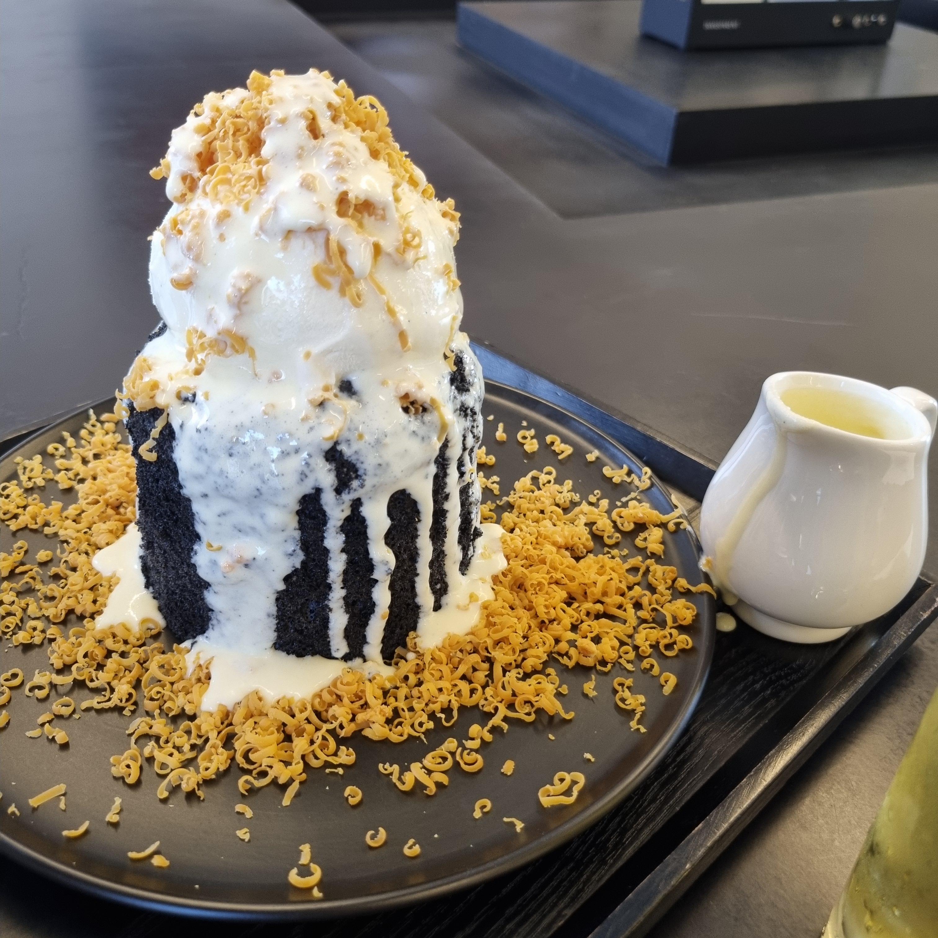 까만 카스테라 위에는 이렇게 바닐라 아이스크림도 듬뿍 올라가 있습니다.